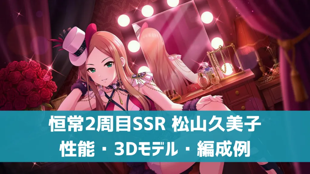2021年1月21日に追加された、2周目恒常SSR[スウィンギング・ナイト]松山久美子の特技、センター効果、編成例などの性能、3Dモデル・イラストなどのビジュアルを確認していきましょう。