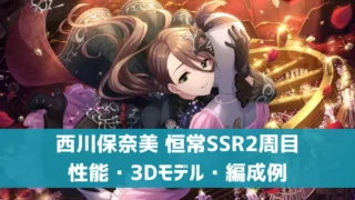 アイドル【デレステ】恒常SSR[ファントム・ソワレ]西川保奈美 特技・センター効果・3Dモデル・セリフまとめ 恒常2周目SSR西川保奈美の特技などの性能お、3DモデルやMVなどをまとめました。ロングアクトなので、フリック多めの楽曲でスコアアップ要員として起用しましょう。 2025.10.19アイドルスキル・特技デレステ