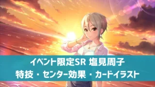 アイドル【デレステ】イベント限定SR[夏恋 -NATSU KOI-]塩見周子 特技・センター効果・セリフまとめ 2019年8月のイベントで登場したSR塩見周子のステータス、カードイラストをまとめました。特技は11秒高確率コンセントレーション。 2025.11.03アイドルスキル・特技デレステ