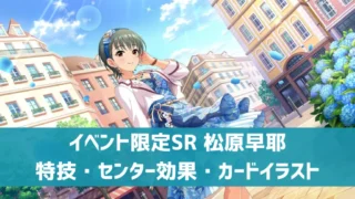 アイドル【デレステ】イベント限定SR[わらって、ハイドレンジア]松原早耶 特技・センター効果・セリフまとめ 2024年6月のイベントで登場したSR松原早耶のステータス、カードイラストをまとめました。特技は17秒中確率ライフ回復。 2025.11.02アイドルスキル・特技デレステ
