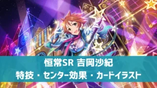 アイドル【デレステ】恒常SR[ボーイッシュエレガント]吉岡沙紀 特技・センター効果・セリフまとめ 2017年4月に登場したSR吉岡沙紀のステータス、カードイラストをまとめました。特技は9秒高確率ダメージガード。 2025.10.25アイドルスキル・特技デレステ