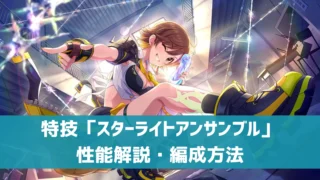 スキル・特技【デレステ】特技「スターライトアンサンブル」とは?編成例・活用法 全タイプ曲で活躍! ニュージェネ3人のアニバ限定SSRが持つ特技「スターライトアンサンブル」について解説!他アイドルの特技効果を極大アップ。全タイプ曲で猛威をふるいます。 2025.09.22スキル・特技デレステ