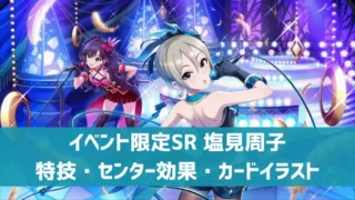 アイドル【デレステ】恒常SSR[夜色の暁風]塩見周子 特技・センター効果・3Dモデル・セリフまとめ 恒常SSR塩見周子の特技などの性能、3DモデルやMVなどをまとめました。特技は13秒高確率SCOREボーナス。 2025.11.03アイドルスキル・特技デレステ